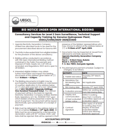 The Uganda Electricity Generation Company Limited (UEGCL) invites qualified international consultants to submit bids for the provision of consultancy services for Level 2 dam surveillance, technical support, and capacity training for the Karuma Hydropower Plant under Open International Bidding.