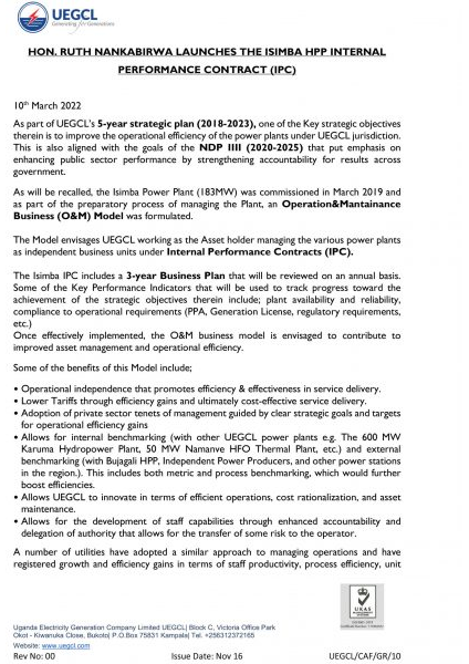 Hon. Ruth Nankabirwa Launches the Isimba HPP Internal Performance Contract (IPC)