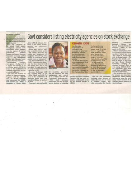 New Vision 08.08 Pg2. Govt considers listing electricity agencies on stock exchange