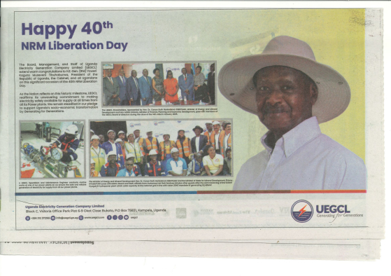 The Board, Management, and Staff of Uganda Electricity Generation Company Limited (UEGCL) extend warm congratulations to H.E. Gen. (Rtd) Yoweri Kaguta Museveni Tibuhaburwa, the Cabinet, and all Ugandans on the occasion of the 40th NRM Liberation Day. As the nation reflects on this historic milestone, UEGCL reaffirms its strong commitment to ensuring the safe, reliable, and continuous generation of electricity from all its power plants.