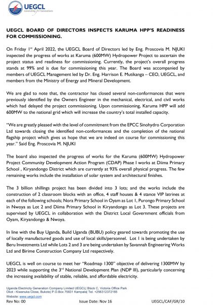 UEGCL BOARD OF DIRECTORS INSPECTS KARUMA HPP’S READINESS FOR COMMISSIONING
