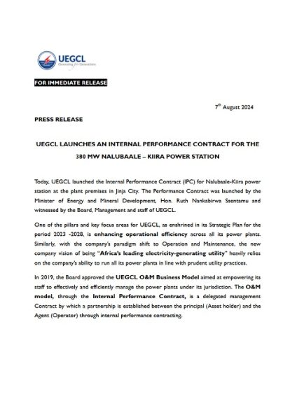 UEGCL Launches An Internal Performance Contract For The 380 Mw Nalubaale – Kiira Power Station