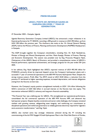 Uganda Electricity Generation Company Limited (UEGCL) announced a 40% increase in revenue for FY 2024/25, reaching UGX 492 billion, up from UGX 350 billion the previous year. The growth was driven by improved dispatch across its hydropower plants and the first year of commercial operations at the 600 MW Karuma Hydropower Plant.